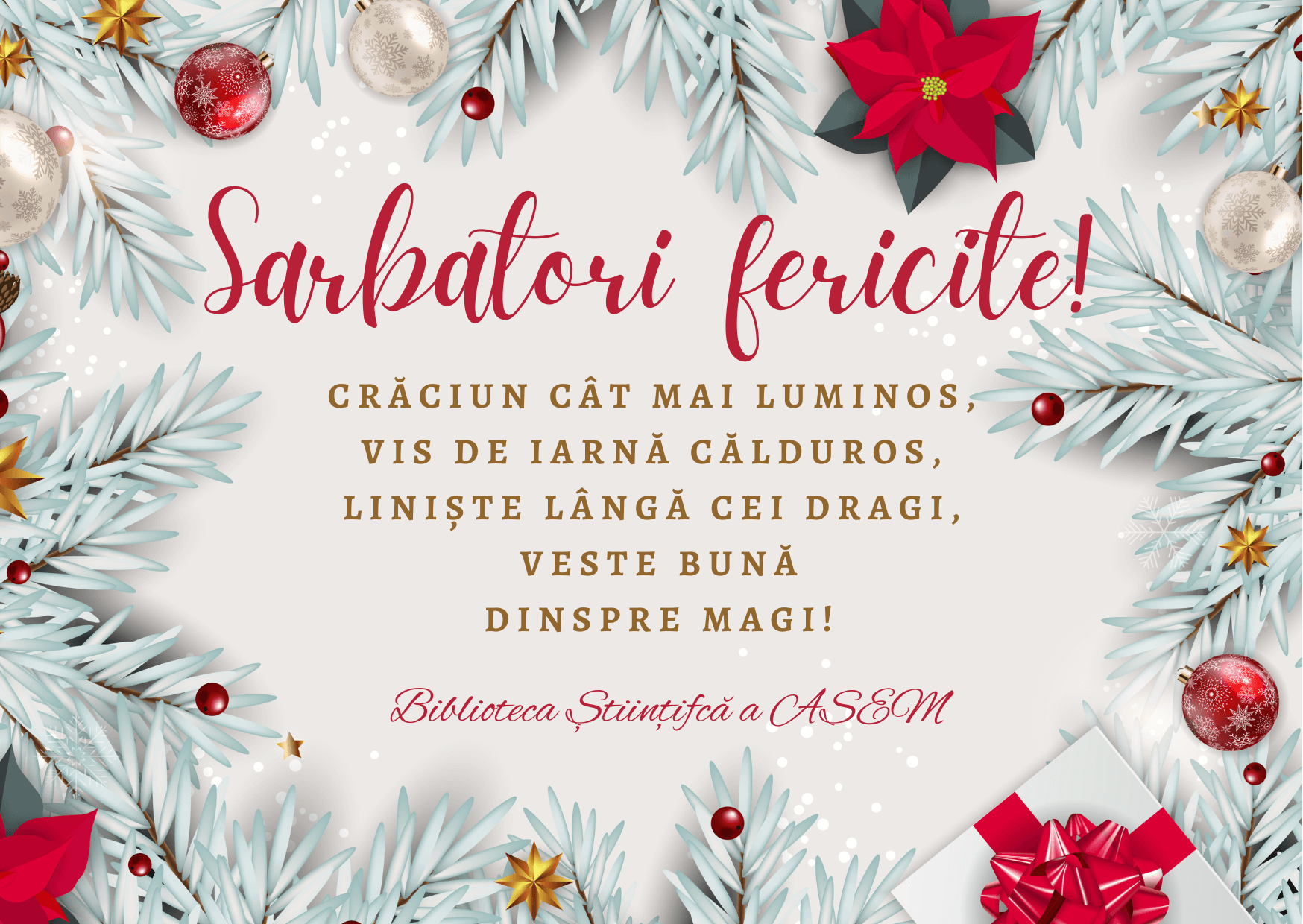 Biblioteca Științifică vă urează sărbători fericite și la mulți ani! bilbiotecar December 23, 2022 Noutati 0 Comments Post navigation Previous Previous post: Invitație la evenimentul „Stop violența! Ai dreptul să trăiești în siguranță! , care va avea loc 6 decembrie 2022, ora 11.20, Sala de Lectură „Comunicarea Colecțiilor”, Bloc F., 103.Next Next post: Stimaţi utilizatori ! Vă prezentăm tematica activităților publice și a expozițiilor de carte organizate de BŞ ASEM în luna ianuarie, 2023. Vă invităm să participați la activități și să vizitaţi expoziţiile în spaţiile bibliotecii. Leave a ReplyYour email address will not be published. Required fields are marked *Comment * Name Email Website