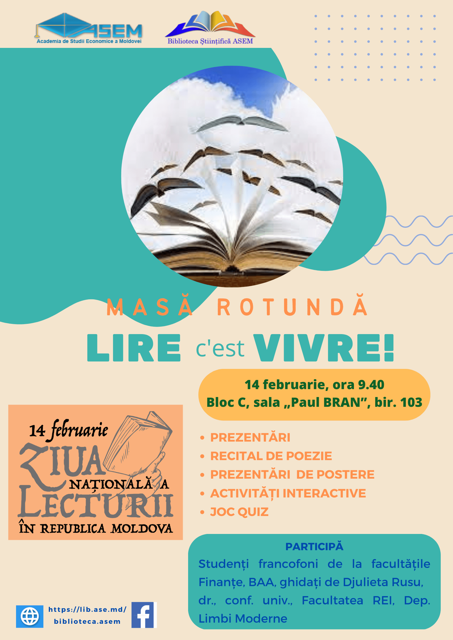 Vă invităm la masa rotundă „LIRE c’est VIVRE!” dedicată Zilei Naționale a Lecturii bilbiotecar February 13, 2023 Noutati 0 Comments Post navigation Previous Previous post: tematica activităților publice și a expozițiilor de carte organizate de BŞ ASEM în luna februarie, 2023Next Next post: Căutarea informațiilor științifice în domeniul economiei în baze de date multidisciplinare și tematice disponibile la Academia de Studii Economice din Moldova Leave a ReplyYour email address will not be published. Required fields are marked *Comment * Name Email Website