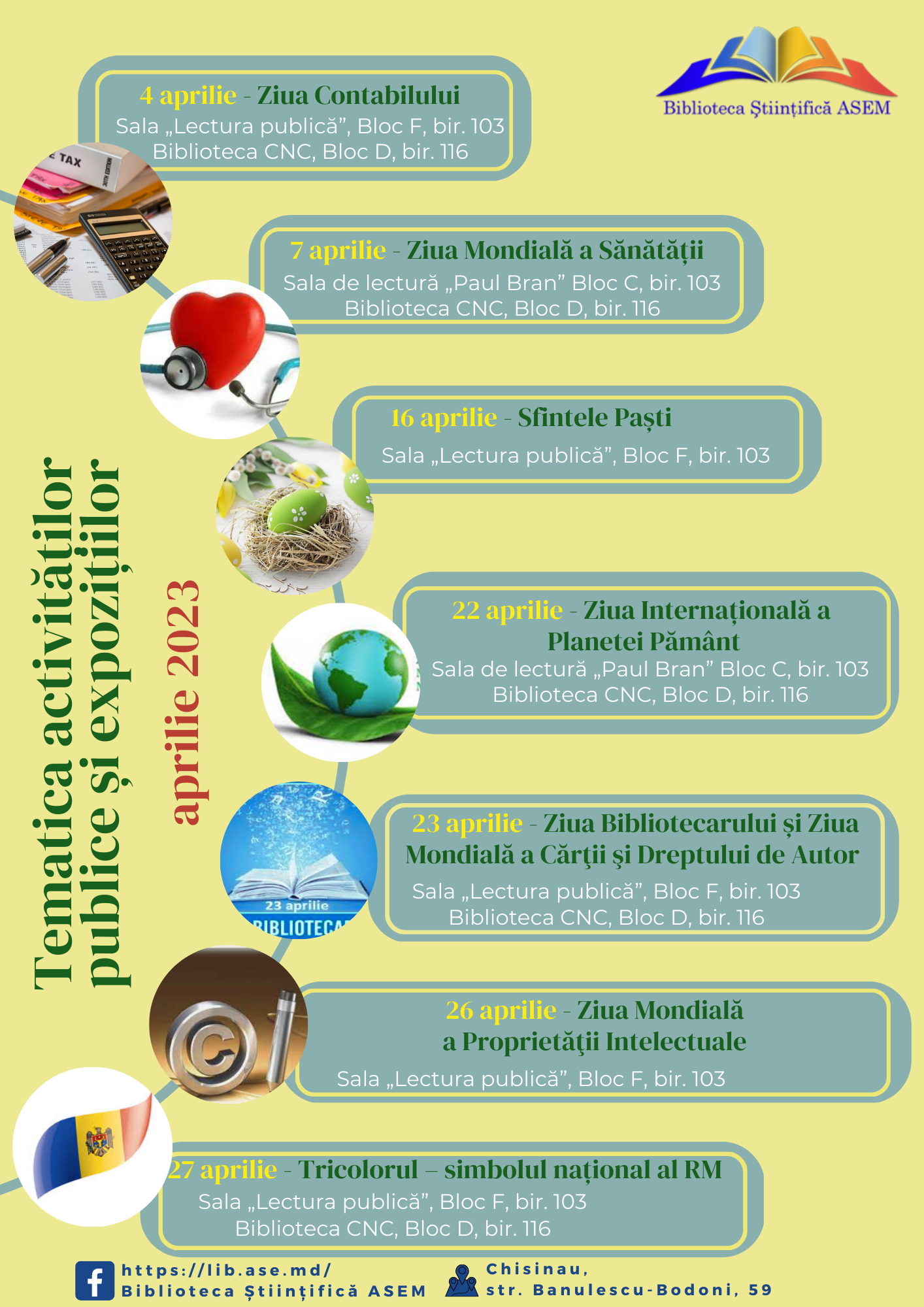 Stimaţi utilizatori ! Vă prezentăm tematica activităților publice și a expozițiilor de carte organizate de BŞ ASEM în luna aprilie, 2023. bilbiotecar April 3, 2023 Noutati 0 Comments Post navigation Previous Previous post: În atenția comunității științifice a ASEM! Vă informăm despre o oportunitate unică pentru cercetătorii din Moldova de a publica articole în reviste științifice internaționale. Detalii AICI.Next Next post: Dragi utilizatori! Fie ca sărbătoarea Sfintelor Paști să vă însenineze viața și să vă aducă Pace și Liniște în casă și în suflet! Hristos a Înviat! Leave a ReplyYour email address will not be published. Required fields are marked *Comment * Name Email Website