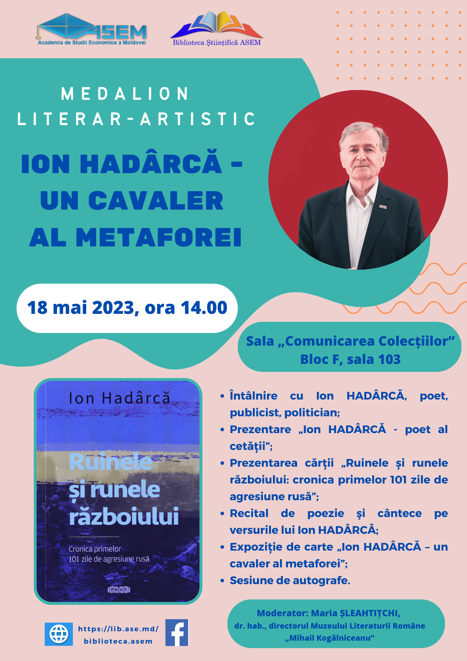 Stimați utilizatori! Vă invităm la întâlnirea cu dl Ion HADÂRCĂ, poet, publicist, politician, care va avea loc pe 18 mai 2023, în Sala de Lectură „Comunicarea Colecțiilor” (Bloc F, 103). DETALII AICI bilbiotecar May 16, 2023 Noutati 0 Comments Post navigation Previous Previous post: În cadrul Zilelor Europei-2023 Biblioteca Științifică a ASEM în colaborare cu profesoara Maria GRÂU-PANȚUREAC, dr., lect. univ., Departamentul Drept, Facultatea Economie Generală și Drept organizează panelul de discuții „EUROPA: Împreună mai Puternici!”, care va avea loc la 10 mai 2023, ora 14.45, Bloc F, bir. 103.Next Next post: Stimați utilizatori! Vă prezentăm tematica activităților publice și a expozițiilor de carte organizate de BȘ ASEM în luna iunie 2023. Vă invităm să participați la activități și să vizitați expozițiile în spațiile bibliotecii. Leave a ReplyYour email address will not be published. Required fields are marked *Comment * Name Email Website