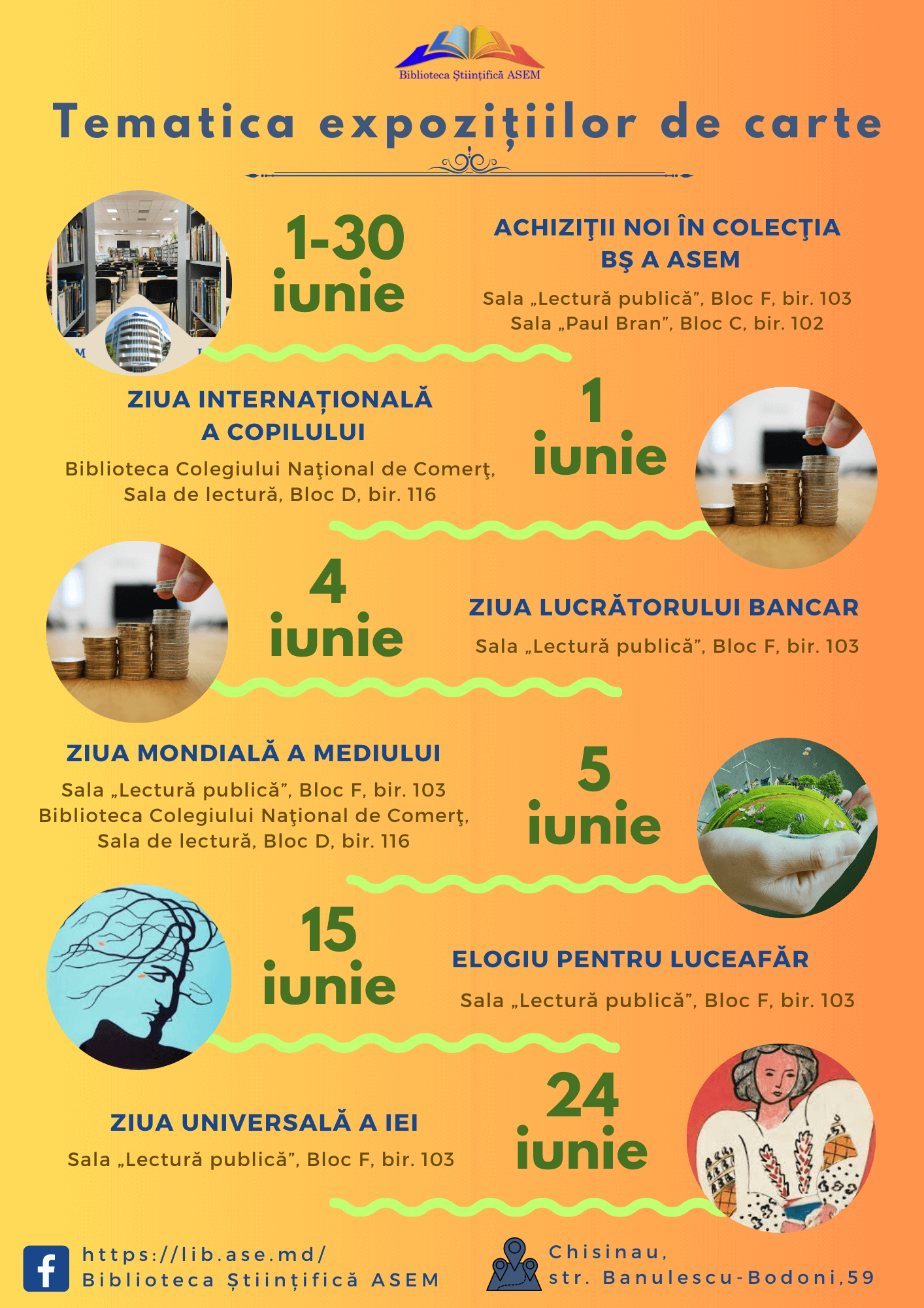 Stimați utilizatori! Vă prezentăm tematica activităților publice și a expozițiilor de carte organizate de BȘ ASEM în luna iunie 2023. Vă invităm să participați la activități și să vizitați expozițiile în spațiile bibliotecii. bilbiotecar May 30, 2023 Noutati 0 Comments Post navigation Previous Previous post: Stimați utilizatori! Vă invităm la întâlnirea cu dl Ion HADÂRCĂ, poet, publicist, politician, care va avea loc pe 18 mai 2023, în Sala de Lectură „Comunicarea Colecțiilor” (Bloc F, 103). DETALII AICINext Next post: În atenția studenților anului I! Biblioteca Ştiinţifică a ASEM eliberează pentru studenții anului I „Permis de intrare”. Detalii AICI. Leave a ReplyYour email address will not be published. Required fields are marked *Comment * Name Email Website