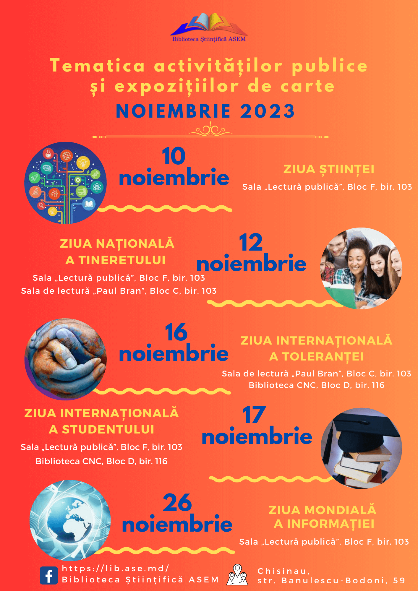 Stimați utilizatori! Vă prezentăm tematica activităților publice și a expozițiilor de carte organizate de BȘ ASEM în luna noiembrie 2023. Vă invităm să participați la activități și să vizitați expozițiile în spațiile bibliotecii! bilbiotecar October 31, 2023 Noutati 0 Comments Post navigation Previous Previous post: Programul Săptămânii Internaționale a Accesului Deschis, 23-29 octombrie 2023Next Next post: Stimați profesori, doctoranzi și masteranzi! Editura Springer și Consorțiul REM vă propune acces în regim de testare la colecția Science Technology & Medicine Library a editurii Springer. DETALII. Leave a ReplyYour email address will not be published. Required fields are marked *Comment * Name Email Website
