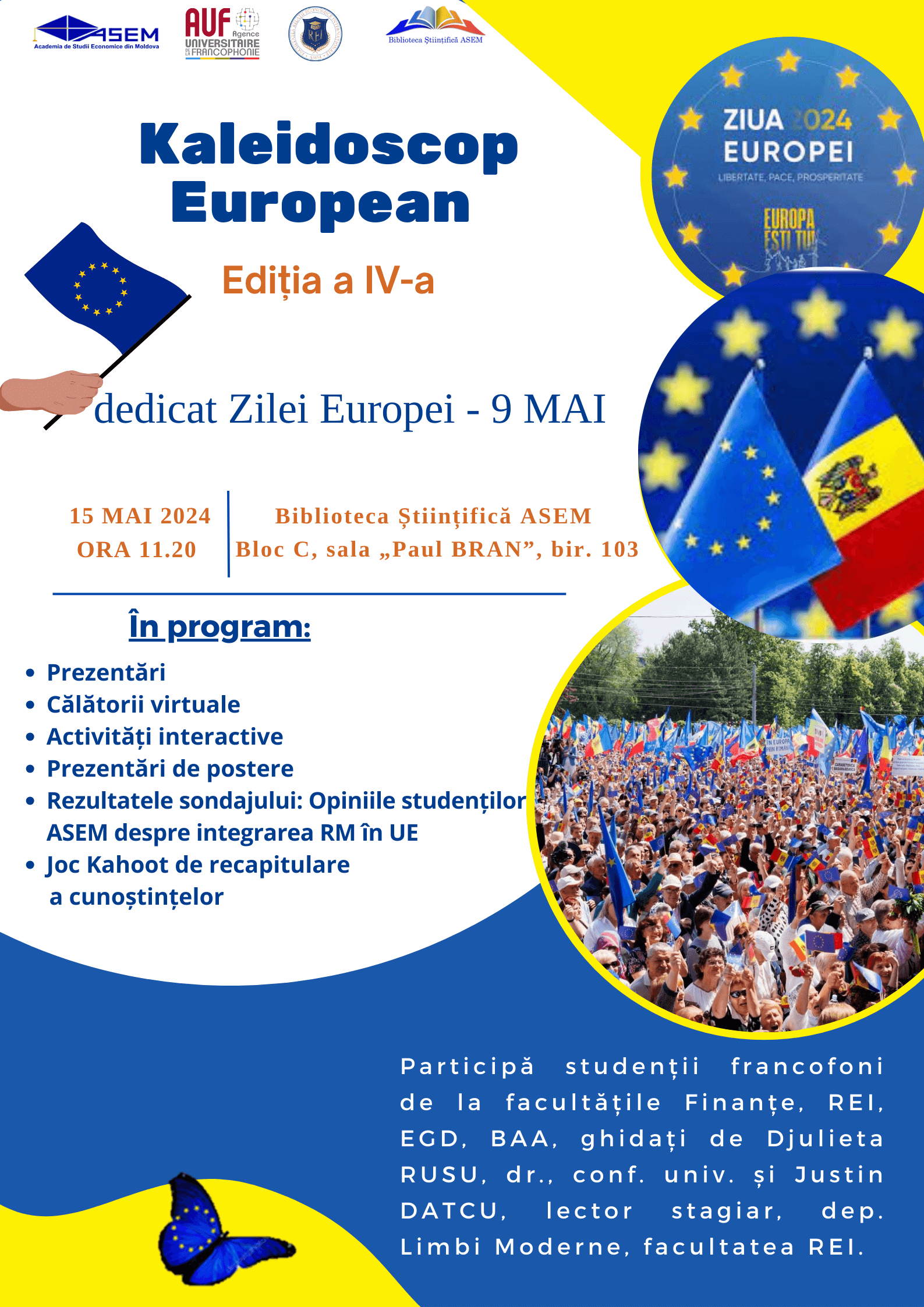 Stimați utilizatori! În cadrul Zilelor EUROPEI 2024 Vă invităm la KALEIDOSCOPUL EUROPEAN, ediția a IV-a. Evenimentul va avea loc pe 15 mai 2024, ora 11.20 în Sala de Lectură „Paul BRAN”, bloc C, 103. DETALII. bilbiotecar May 14, 2024 Noutati 0 Comments Post navigation Previous Previous post: Stimați utilizatori! Vă prezentăm tematica activităților publice și a expozițiilor de carte organizate de BȘ ASEM în luna mai 2024. Vă invităm să participați la activități și să vizitați expozițiile în spațiile bibliotecii!Next Next post: Stimați utilizatori! Vă prezentăm tematica activităților publice și a expozițiilor de carte organizate de BȘ ASEM în luna septembrie 2024. Vă invităm să participați la activități și să vizitați expozițiile în spațiile bibliotecii! Leave a ReplyYour email address will not be published. Required fields are marked *Comment * Name Email Website