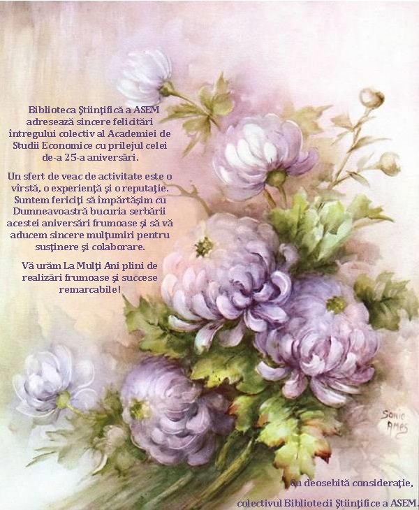 Biblioteca Ştiinţifică a ASEM adresează sincere felicitări întregului colectiv al Academiei de Studii Economice cu prilejul celei de-a 25-a aniversări. bilbiotecar September 22, 2016 Noutati 0 Comments Post navigation Previous Previous post: Modernizarea serviciilor bibliotecilor universitare din MoldovaNext Next post: Stimaţi utilizatori ! Vă prezentăm tematica activităţilor publice şi a expoziţiilor de carte organizate de către BŞ ASEM în luna octombrie 2016. Vă invităm să participaţi la activităţi şi să vizitaţi expoziţiile în spaţiile bibliotecii. Leave a ReplyYour email address will not be published. Required fields are marked *Comment * Name Email Website