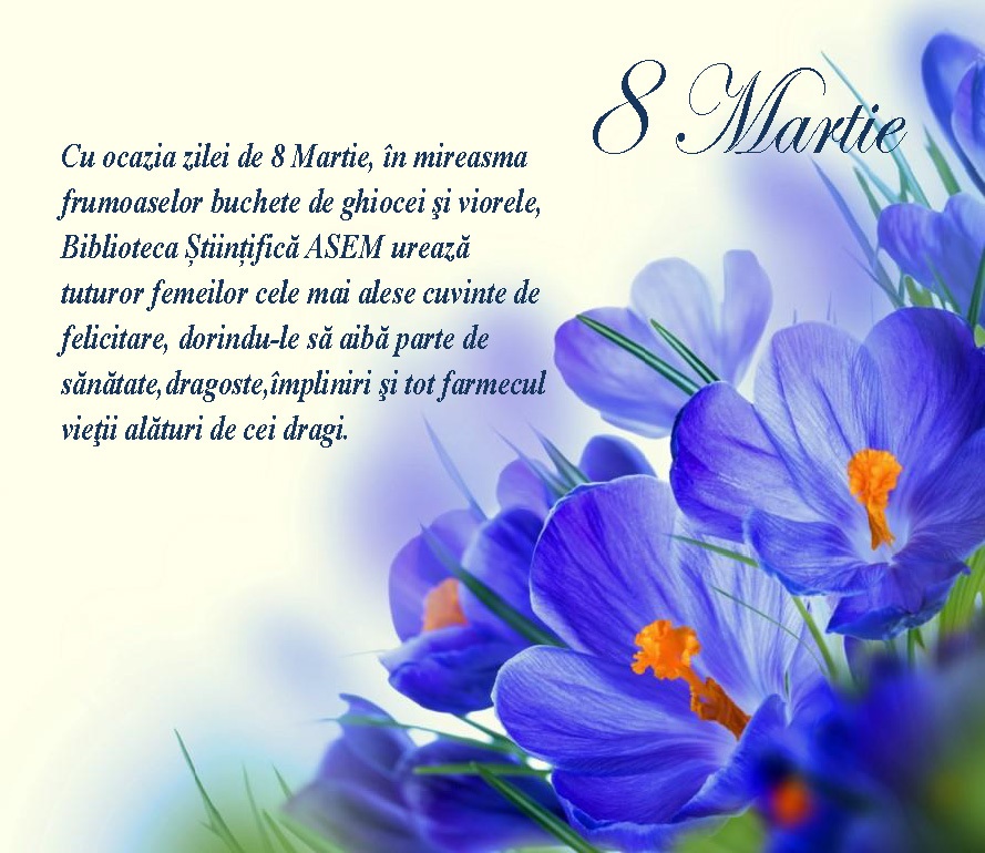 Cu ocazia zilei de 8 martie, in mireasma frumoaselor buchete de ghiocei si viorele, Biblioteca Stiintifica ASEM ureaza tuturor femeilor… bilbiotecar March 7, 2017 Noutati 0 Comments Post navigation Previous Previous post: Omagiu aniversar: “Ada Ştahovshi doctor în economie, conferenţiar universitar, Catedra Contabilitate şi Audit”Next Next post: Omagiu aniversar: “Natalia Coşelev – doctor în economie, conferenţiar universitar, catedra Teorie şi Politici Economice” Leave a ReplyYour email address will not be published. Required fields are marked *Comment * Name Email Website