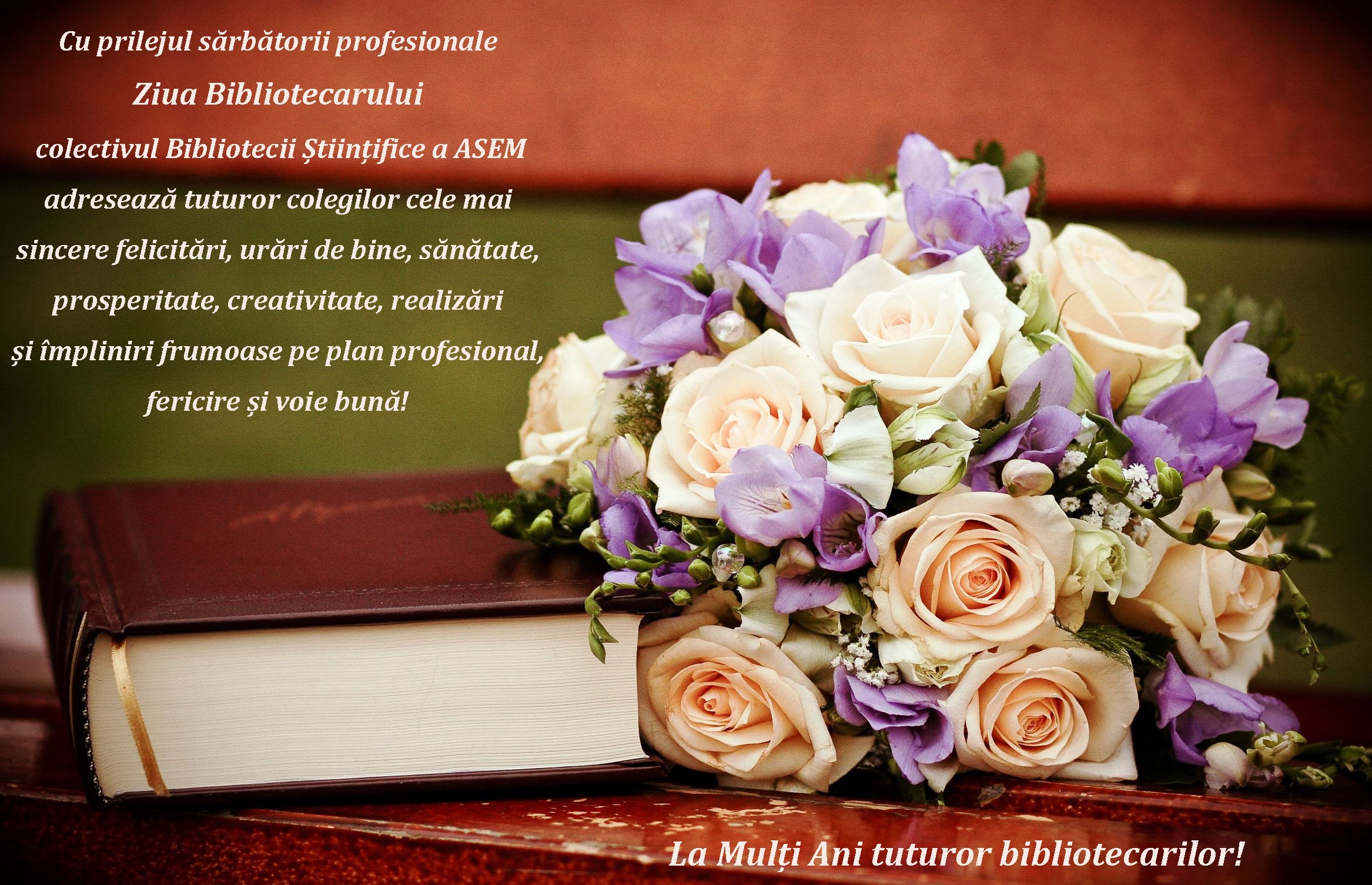 La Mulți Ani tuturor bibliotecarilor! Cu prilejul sărbătorii profesionale Ziua Bibliotecarului colectivul Bibliotecii Științifice a ASEM adresează tuturor colegilor cele mai sincere felicitări, urări de bine, sănătate, prosperitate, creativitate, realizări și împliniri frumoase pe plan profesional, fericire și voie bună!