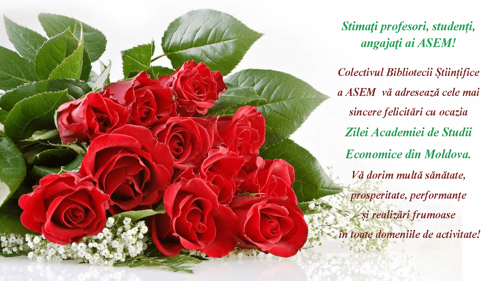 Stimaţi profesori, studenți, angajaţi ai ASEM! Colectivul Bibliotecii Științifice a ASEM vă adresează cele mai sincere felicitări cu ocazia Zilei Academiei de Studii Economice din Moldova. Vă dorim multă sănătate, prosperitate, performanțe și realizări frumoase în toate domeniile de activitate!