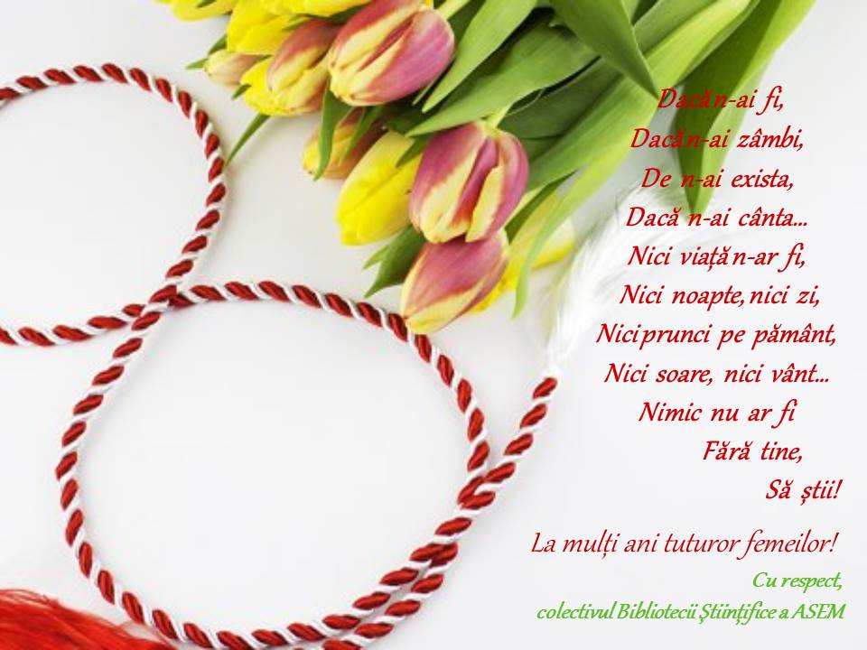 Sincere felicitări Doamnelor și Domnișoarelor cu ocazia zilei de 8 Martie! bilbiotecar March 5, 2020 Noutati 0 Comments Post navigation Previous Previous post: Stimaţi utilizatori ! Vă prezentăm tematica activităţilor publice şi a expoziţiilor de carte organizate de către BŞ ASEM în luna martie, 2020. Vă invităm să participaţi la activităţi şi să vizitaţi expoziţiile în spaţiile bibliotecii.Next Next post: Omagiu aniversar: Dumitru TODOROI – Membru corespondent al ARA, profesor universitar, doctor habilitat. Leave a ReplyYour email address will not be published. Required fields are marked *Comment * Name Email Website