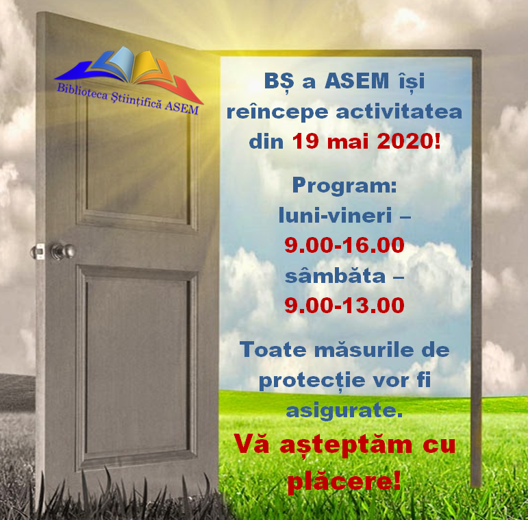 Dragi studenți și profesori! Cu bucurie vă anunțăm că din 19 mai 2020 BȘ a ASEM își reîncepe activitatea! Program: luni-vineri – 9.00-16.00, sâmbăta – 9.00-13.00. Toate măsurile de protecție vor fi asigurate. Vă așteptăm cu plăcere! bilbiotecar May 18, 2020 Noutati 0 Comments Post navigation Previous Previous post: Răspunsul Uniunii Europene la pandemia de coronavirus în țările Parteneriatului EsticNext Next post: Omagiu aniversar: Lilia GRIGOROI – Conferențiar universitar, doctor în economie, decanul Facultății „Contabilitate” Leave a ReplyYour email address will not be published. Required fields are marked *Comment * Name Email Website