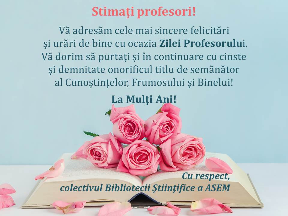STIMAȚI PROFESORI! Vă aducem cele mai sincere si frumoase urări de bine, sănătate și prosperitate cu ocazia sărbătorii profesionale. Vă spunem cuvinte de mulțumire pentru munca imensă pe care o depuneți pentru educarea și instruirea tinerelor generații.